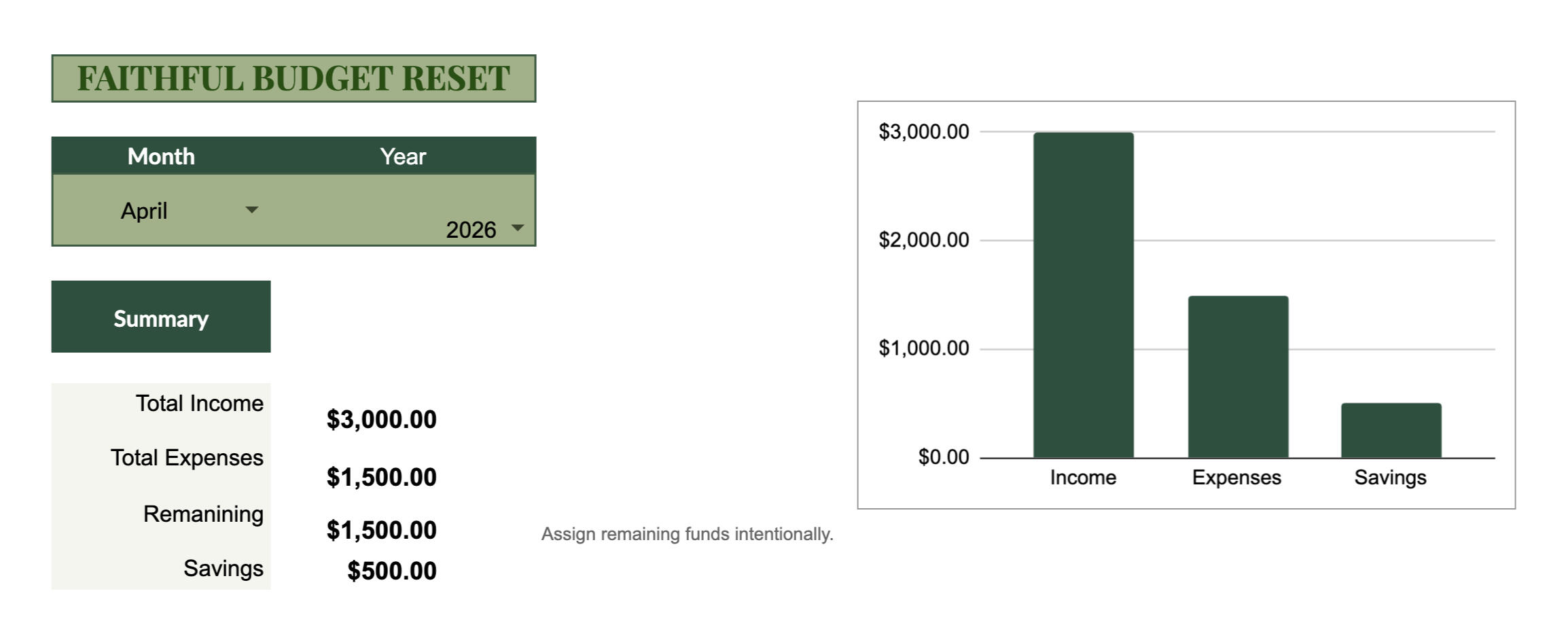 Budgeting often feels complicated or overwhelming.The Faithful Budget Reset was designed to simplify the process. Instead of complex systems, this sheet focuses on clarity: what comes in, what goes out, and what remains.A simple monthly reset can help you become more aware of your spending habits and make intentional financial decisions.