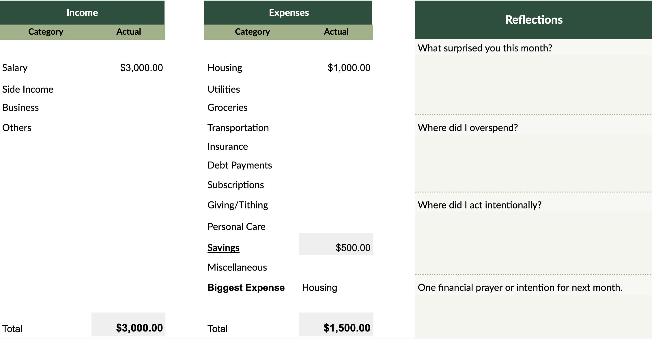A simple monthly budget sheet to track income, expenses, savings, and reflect intentionally.